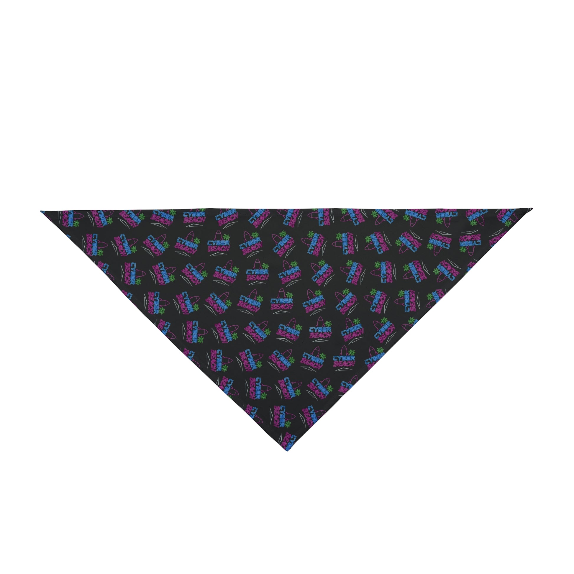 Black triangular pet bandana stamped with a vibrant neon ’Cyber Beach’ design — electric blues, hot pinks, and lime green palm accents that pop against the dark background. Lightweight and quick-drying, it slips on to collars or ties easily, bringing a retro synthwave vibe to daily walks, beach days, or evening outings. It looks lively on playful pups and chill cats alike, adding color and personality without weighing them down. The hemmed edges and sewn-in label give it a finished, durable feel that holds up to regular wear. Use it to lift a routine afternoon stroll into something a little more fun, or to make a memorable statement at summer gatherings, night markets, or themed photoshoots.