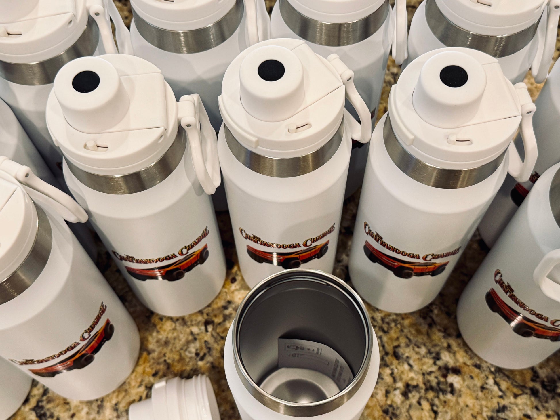 High quality stainless steel ramble bottles with the iconic Chattanooga Charge logo imprinted.