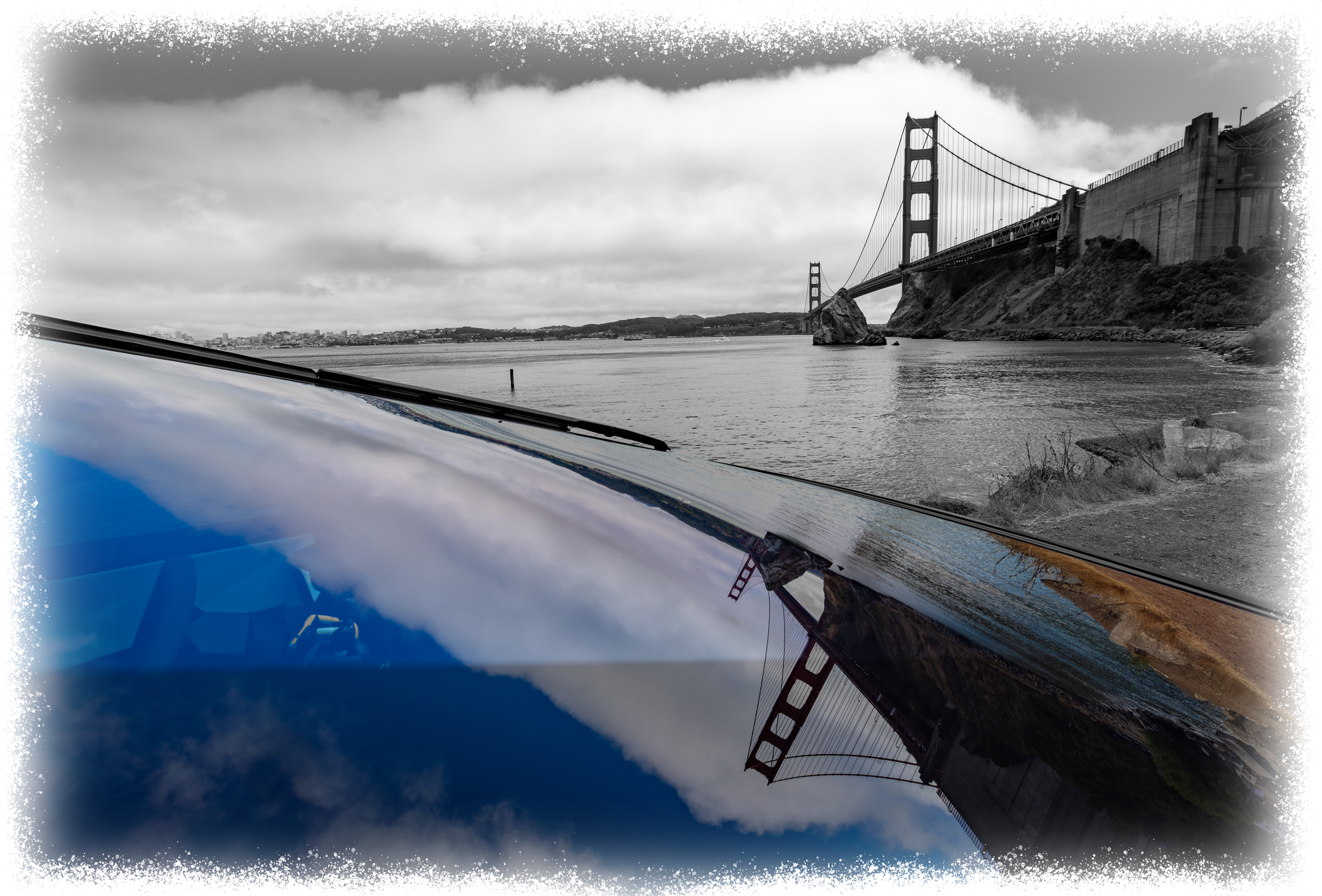 Part of the Cybertruck Black & White Collection. This scene features a Cybertruck reflecting the San Francisco Bridge.