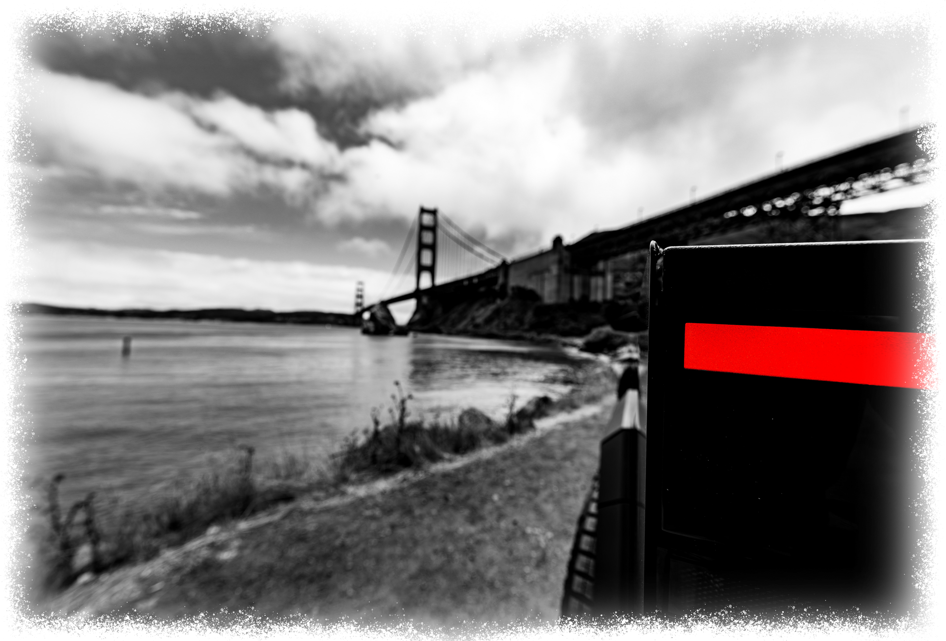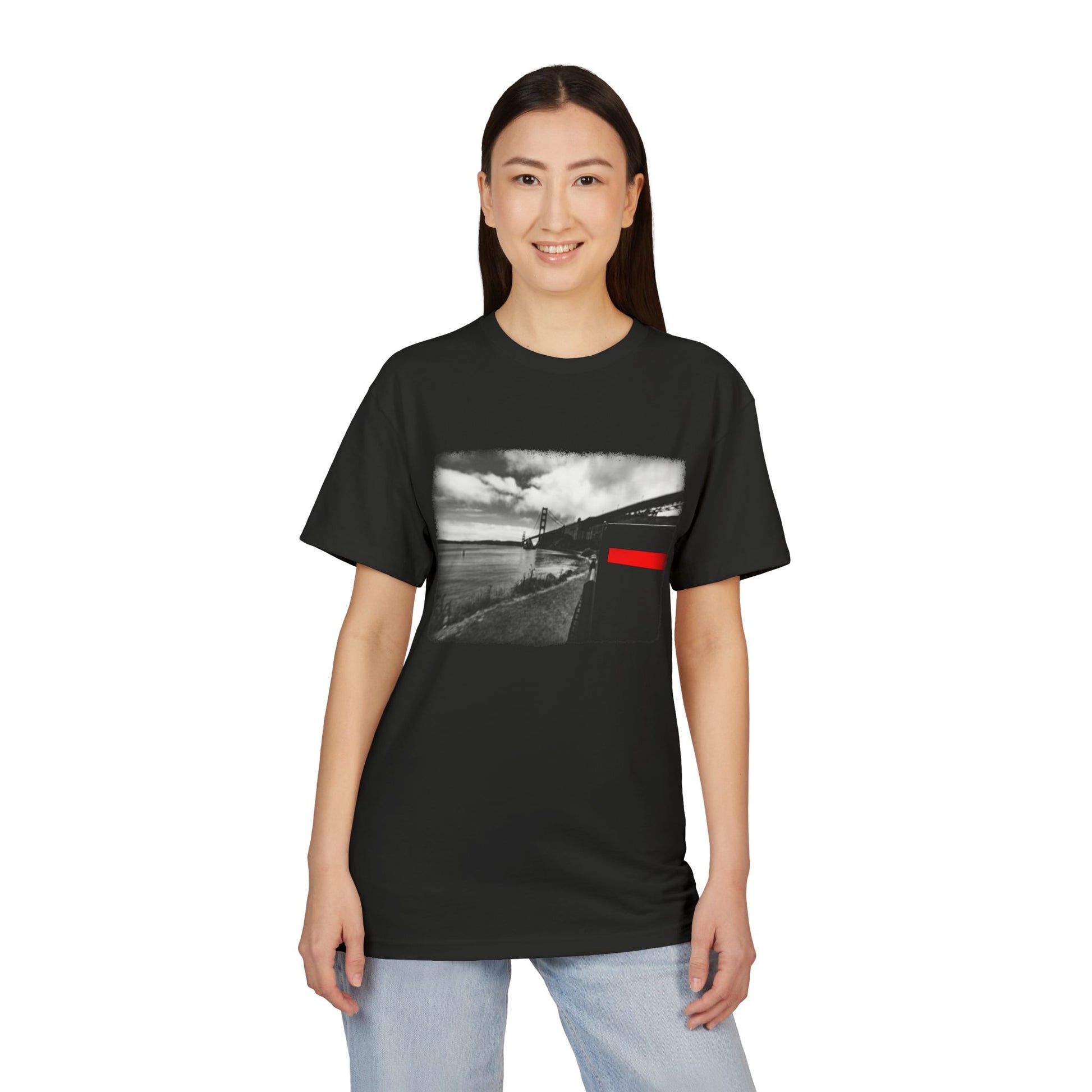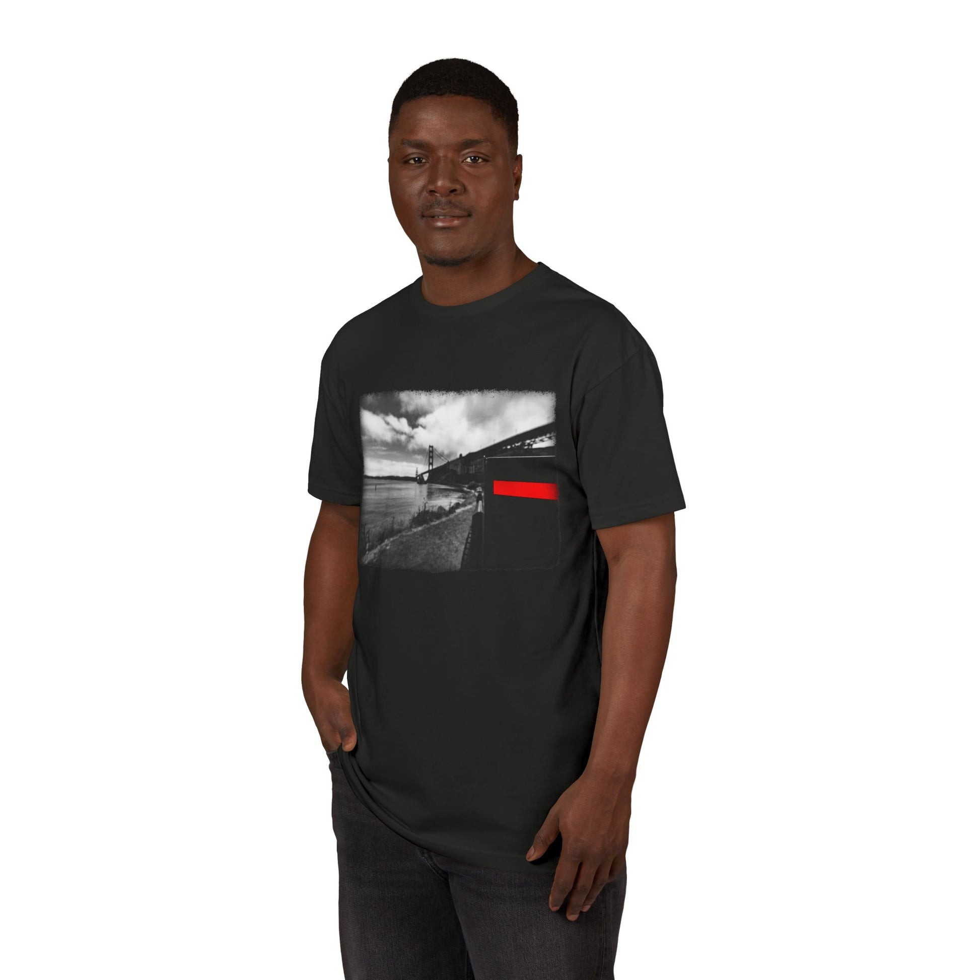 Part of the Cybertruck Black & White Collection. This scene features a Cybertruck stopped beneath the San Francisco Bridge.