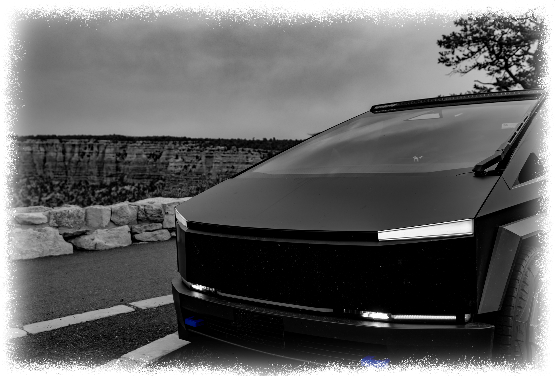Part of the Cybertruck Black & White Collection. This scene features a Cybertruck stopped by one of the many lookout points at the Grand Canyon South Rim.