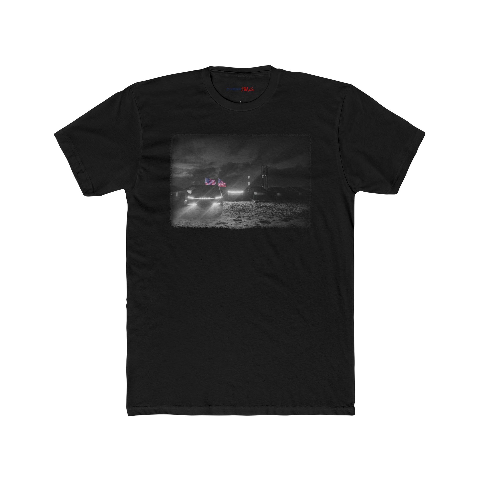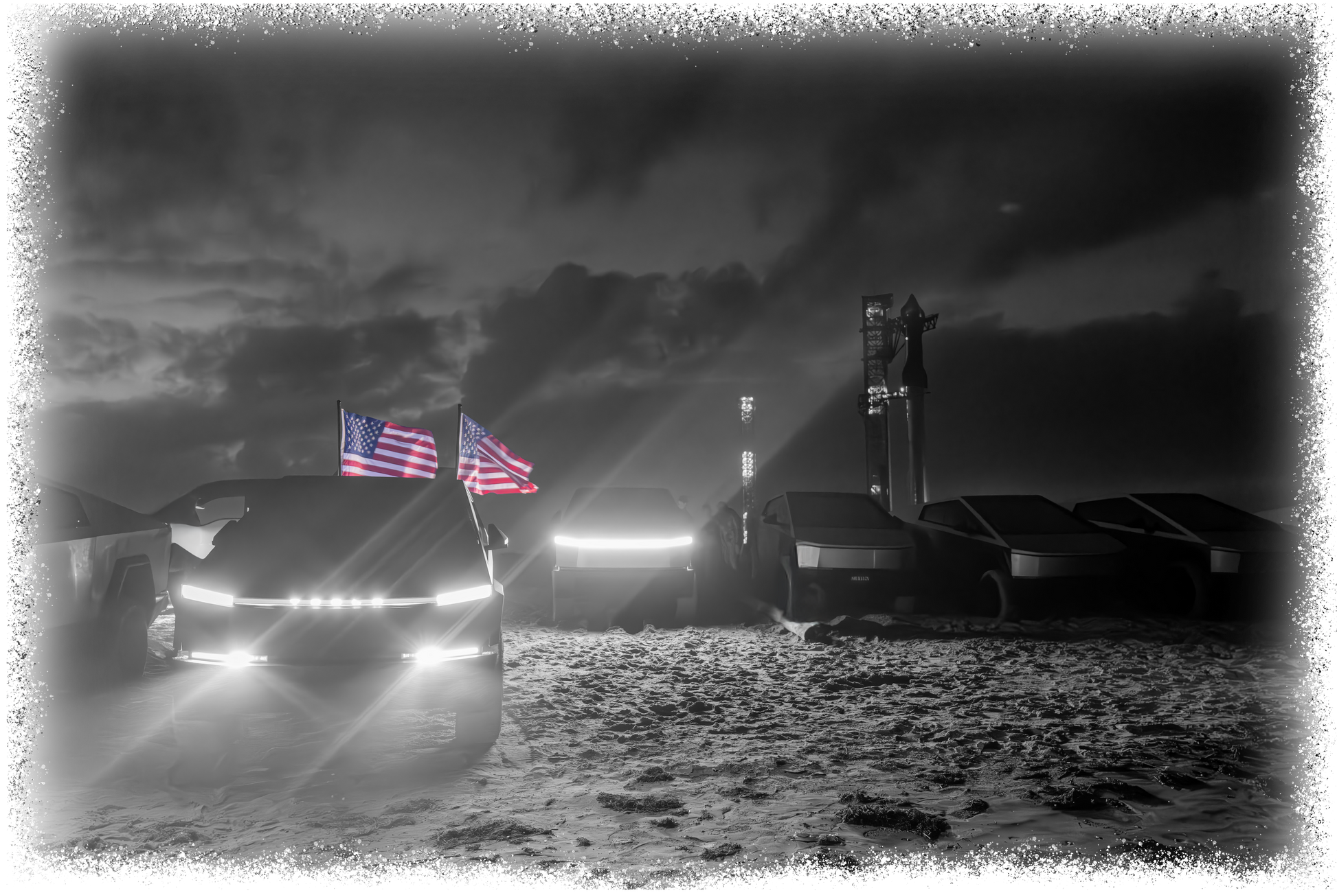 Part of the Cybertruck Black & White Collection. This scene features several Cybertrucks on Cyber Beach in front of Starship.