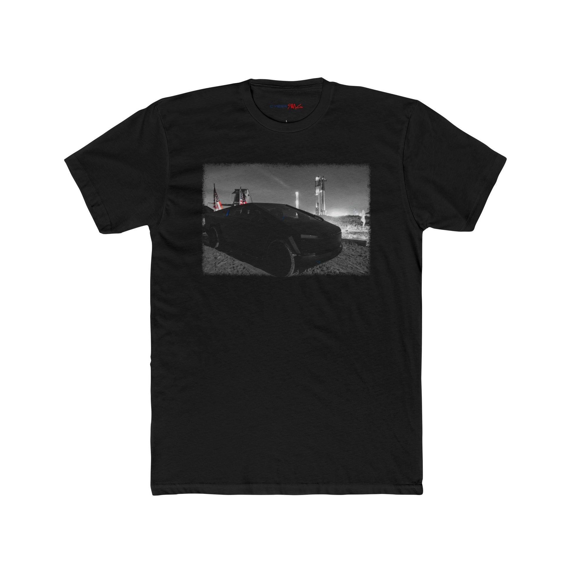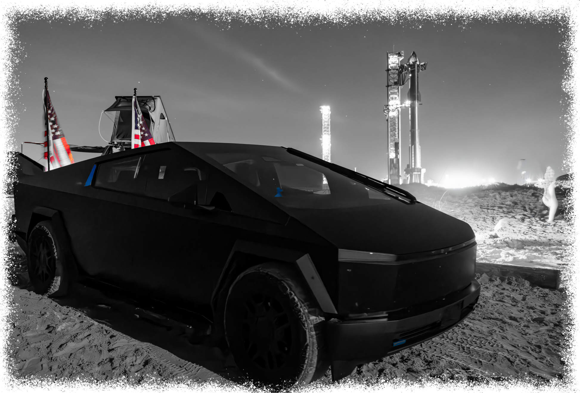 Part of the Cybertruck Black & White Collection. This scene features a Cybertruck on Cyber Beach with a stacked Starship in the background.
