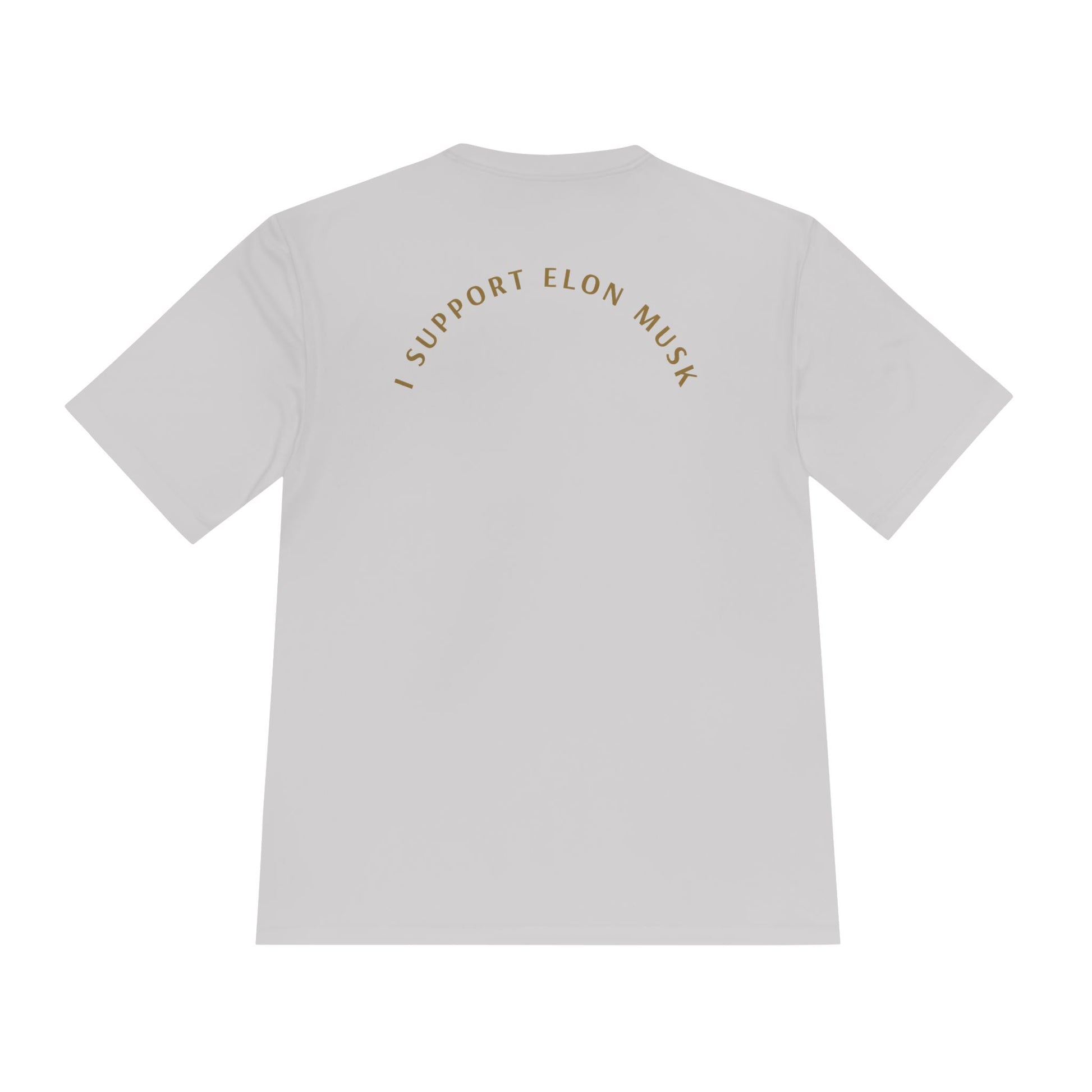 This Sport-Tek® PosiCharge® Competitor™ Tee is an athlete's dream come true. This lightweight, moisture-wicking, and highly breathable shirt comes with set-in sleeves, a 100% polyester fabric, and PosiCharge® technology that helps lock colors in and prevent logos from fading. Bronze-gold ink details—small chest emblem and a curved back line reading "I SUPPORT ELON MUSK"—give this shirt a subtle, rallying presence without shouting. It layers easily under jackets or wears alone on warm days.