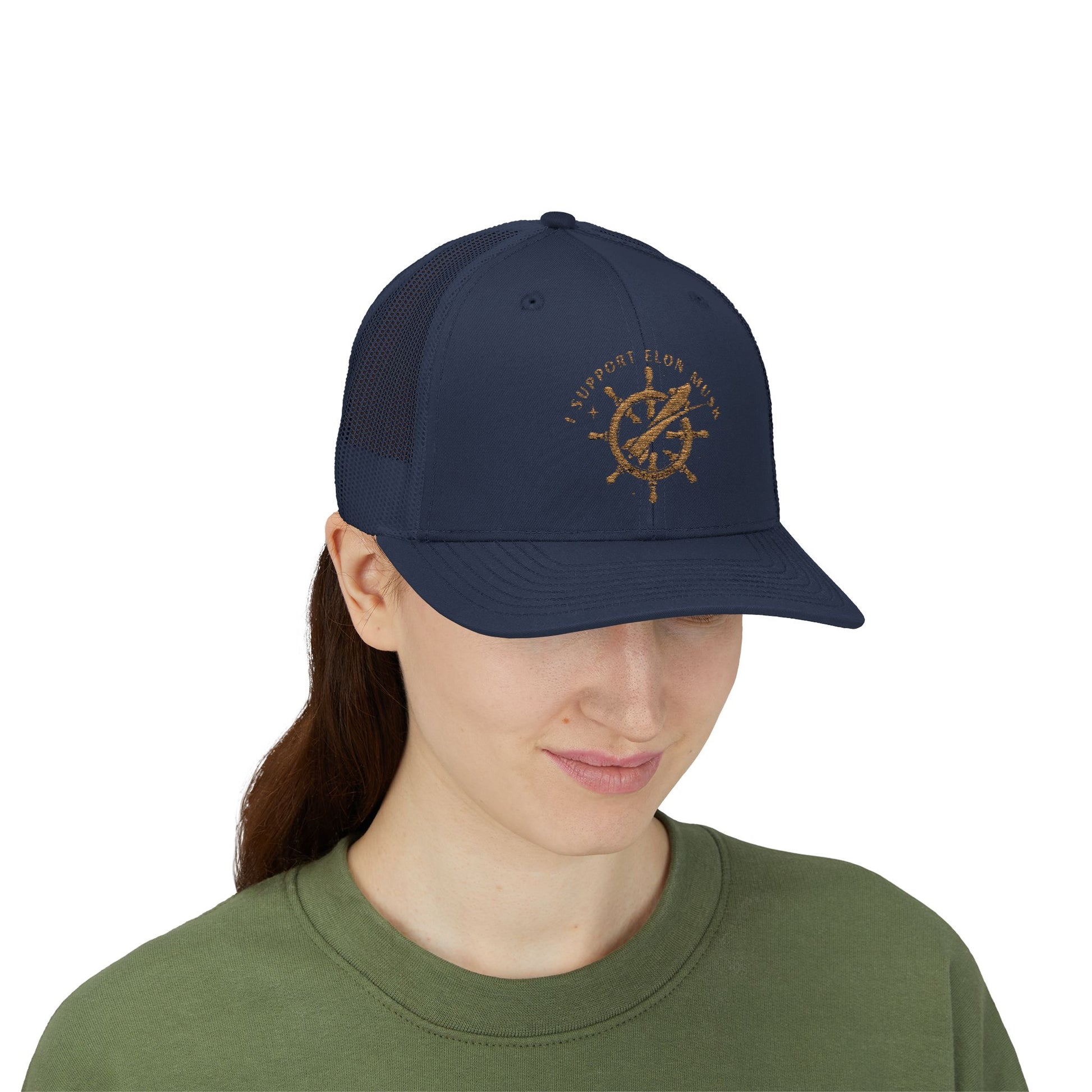 A structured snapback trucker cap with a crisp, nautical-inspired emblem embroidered on the front. The mid-profile silhouette and hard-buckram front keep the shape crisp, while the ventilated mesh back and precurved Permacurv® visor offer all-day comfort in sun and sea breezes. Lightweight cotton-blend front panels and a soft cotton sweatband make it wearable during long walks on the pier or weekend fishing trips. The adjustable plastic snap closure ensures a reliable fit for most adult heads. Subtle branding on the visor sticker and sewn-in label give it an authentic, lived-in feel that pairs well with faded denim and salty hair.